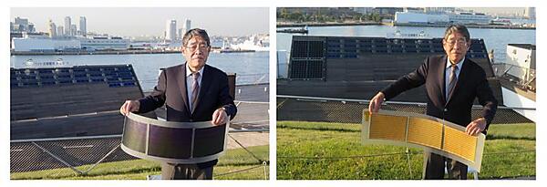 今回の実証実験ではフィルム型PSCパネルを約80枚使用。写真はPSCパネルを持つ宮坂 力氏(ペクセル・テクノロジーズ)