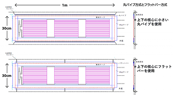 実証実験場では、図2に示すように2種類用意されており、1つは、PSCパネルの天地に小さな丸い棒を巻き付けてテンションをかけ、パネル表面の張力を最適に調整できるようにしたもの(図2上部。前編で紹介)。もう1つは、上下に固定式フラットバーを設定し、そこでPSCパネルを挟み込んで設置する(図2下部)。これは従来、有機薄膜パネルなどで用いられている方式である。
