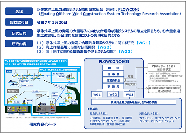 出所 国土交通省、港湾局海洋・環境課 プレスリリース 令和7(2025)年1月16日、 「浮体式洋上風力建設システム技術研究組合(FLOWCON)の認可について」の別紙1