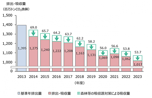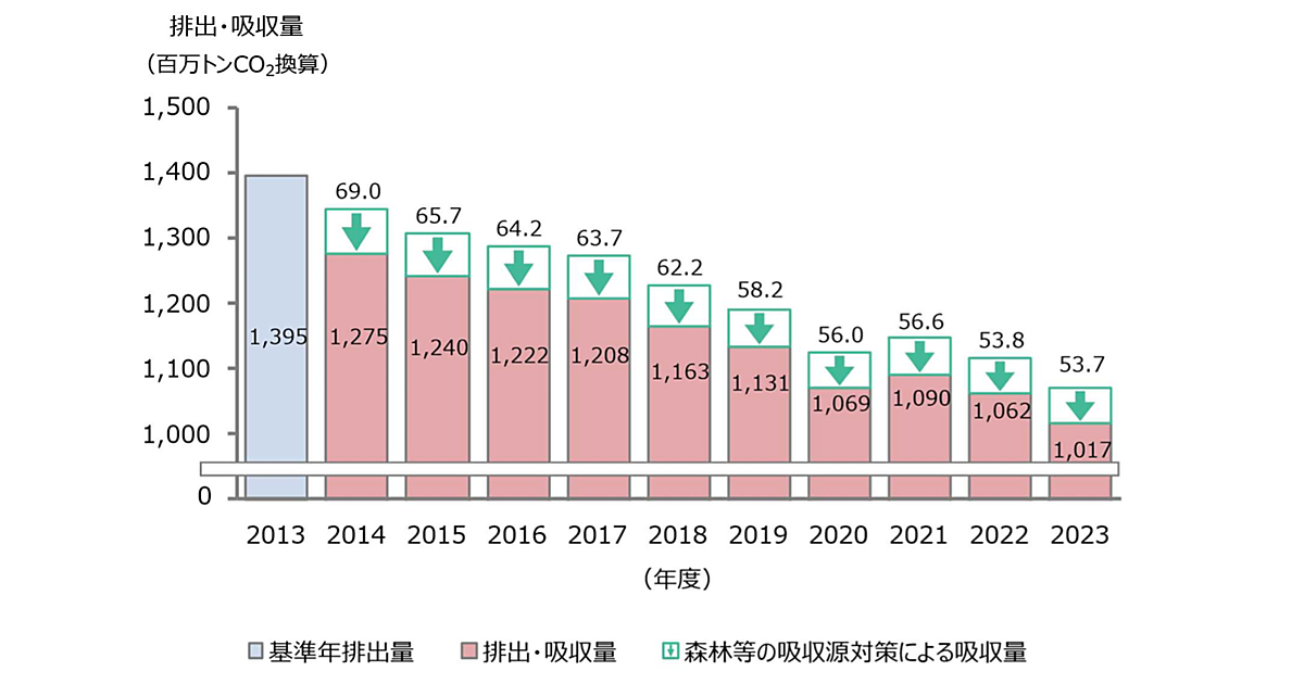 2023年度の国内における温室効果ガスの排出量は10億7100万トンであり、2022年度比で4.0%(4490万トン)減少した。2013年度比では23.3%(3億2440万トン)減少している。