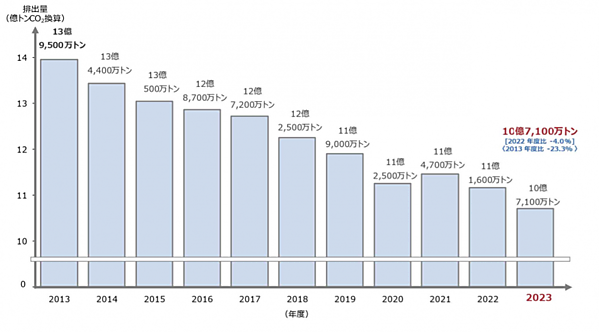 2022年度と比べて2023年度の排出量が減少した主な要因として、再生可能エネルギーの利用拡大と原子力発電の再稼働により、電源構成に占める両者を合計した割合が3割超えた点や、製造業の国内生産活動が減少したことでエネルギー消費量の減少した点を環境省は挙げている。