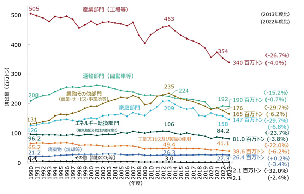 CO2排出量を部門別にみると、2023年度は産業部門が3億4000万トンと前年度比で4.0%(約1,400万トン)減少した。