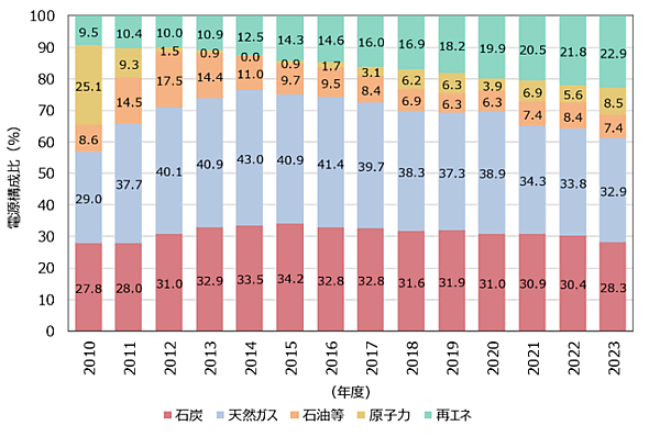 2023年度の電源構成に占める再生可能エネルギーの割合は22.9%で、2022年度から1.0ポイント増加している。原子力は8.5%で、2022年度から2.9ポイント増加した。
