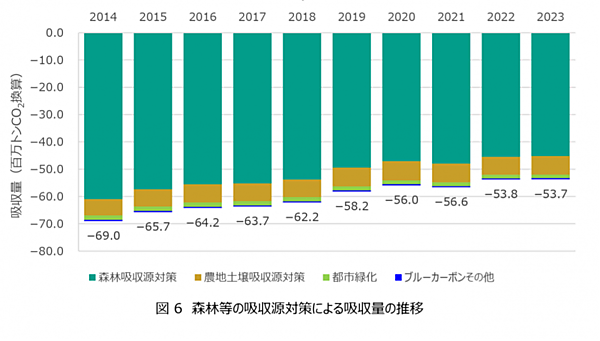 森林やブルーカーボン注2といった吸収源対策による温室効果ガスの吸収量は、2023年度が約5370万トンで、前年度(約5380万トン)とほぼ同量だった。