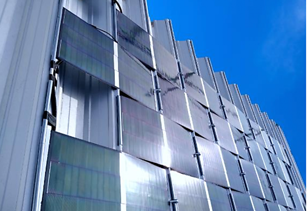 発電モジュールは、日揮が産業関連施設の屋根向けに開発した「シート工法」を用いて、工場や倉庫などの折板屋根を模した屋外環境に施工した。同工法は、遮熱シートに薄膜太陽電池を載せたものを発電モジュールとして一体化し、グリッパーと呼ぶ金具で屋根に着脱可能な状態で固定するというもの。カルコパイライト太陽電池をはじめとする薄膜太陽電池が持つ、軽量、薄い、曲がるという特徴を損なわずに使用できる。