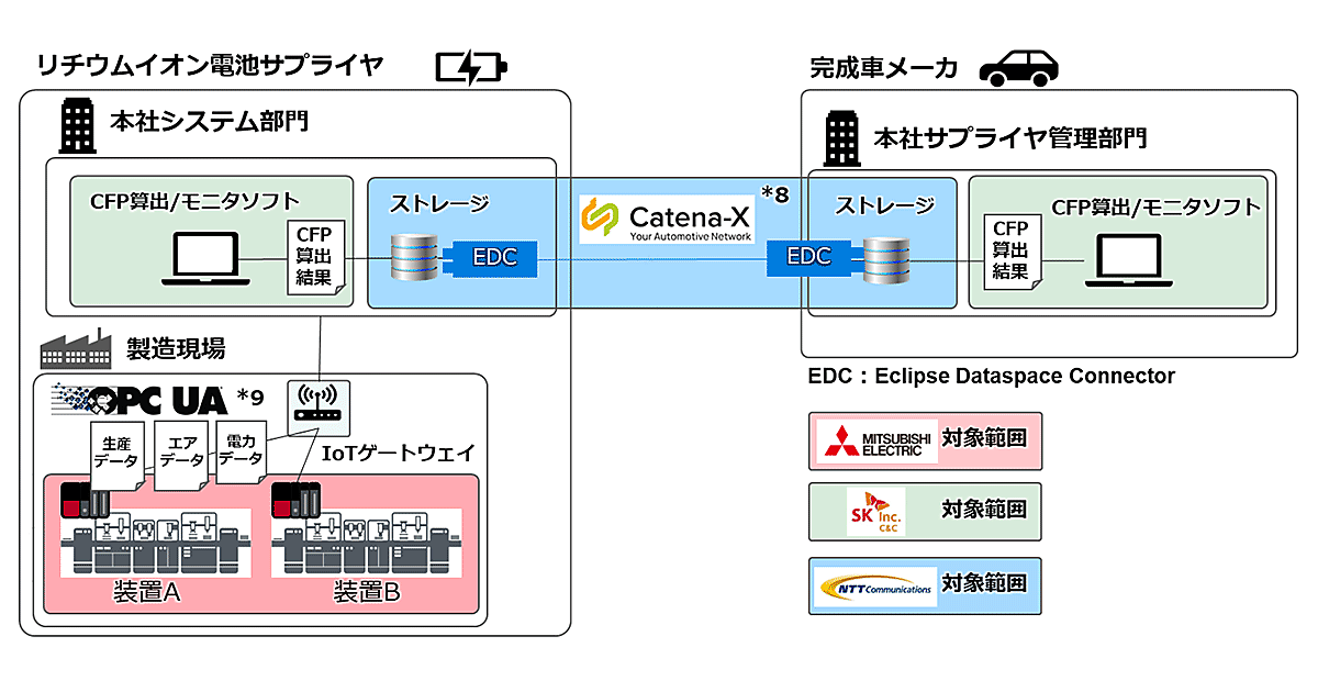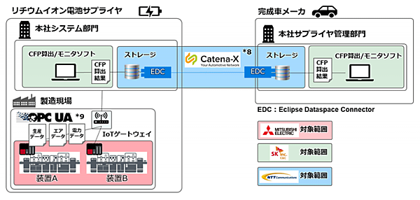 三菱電機が製造現場での模擬環境の提供と、製造現場のデータ収集/関連開発を担当する。NTT Comは、「Catena-X」標準の通信手順/データ形式に対応するシステム間データ通信機能を提供するとともに、実証実験用のIT環境を提供。SK C&Cは、CFP算出/モニタソフトを提供する。