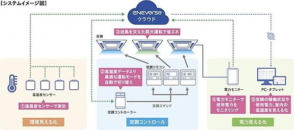 空調管理システムは、温湿度センサーで室内環境の変化をリアルタイムで計測し、設定温度と不快指数にもとづいて空調の運転モードを自動で切り替える。設定温度や、時間帯や曜日ごとに空調の運転状態を自動で切り替えるスケジュール機能の設定は、遠隔から変更が可能。これらにより、室内の快適性を維持しながら、使用電力量を削減できるという。空調機は、メーカーを問わずに使用できる。
