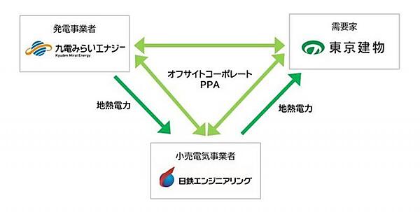 東京建物株式会社(以下、東京建物)と日鉄エンジニアリング株式会社(以下、日鉄エンジニアリング)、九電みらいエナジー株式会社(以下、九電みらいエナジー)の3社は、遠隔地の地熱発電を活用したオフサイトコーポレートPPA(Power Purchase Agreement:電力購入契約)注1を、東京建物が所有・管理する都内のオフィスビルに導入した。ビルの再生可能エネルギー自給率を高めるとともに、都心部における再生可能エネルギーの調達という課題の解消につなげるという。地熱発電を用いたオフサイトコーポレートPPAの導入は、不動産業界で初だという。2025年6月5日に発表した。