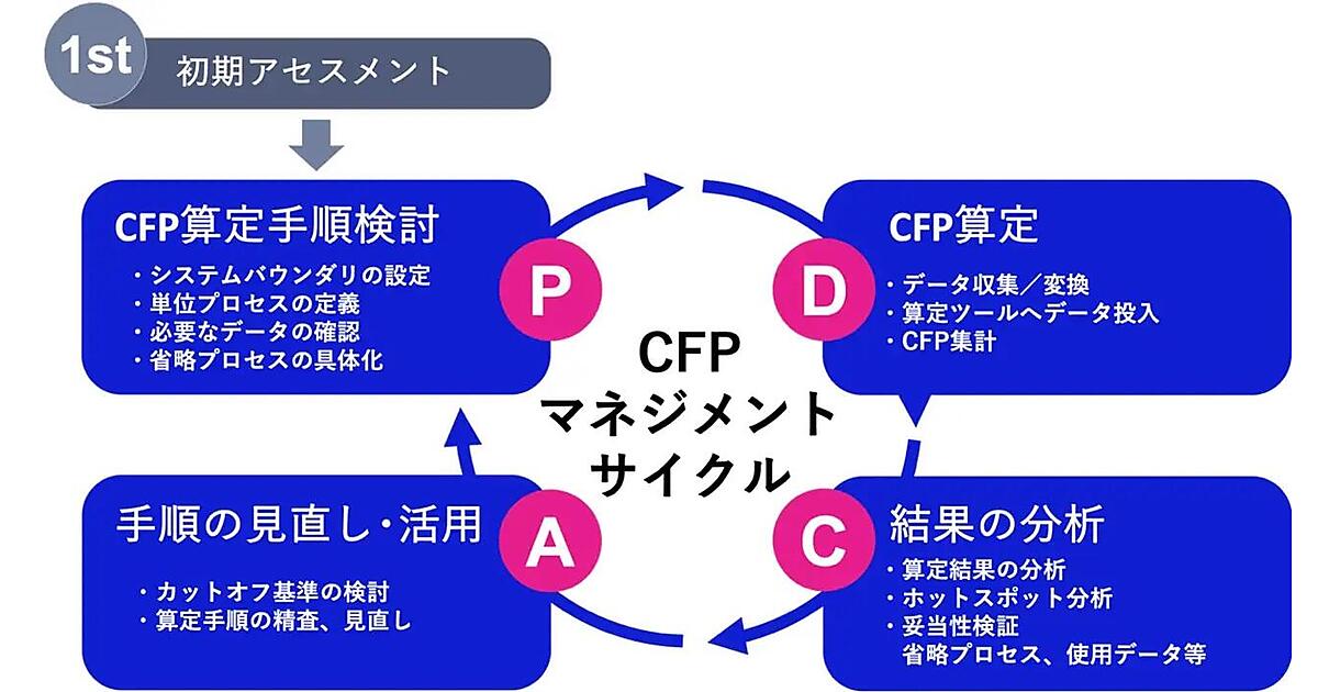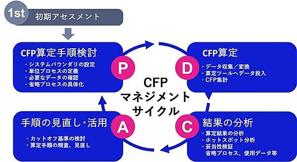 PoCでは、アセスメントで選定した1つの製品を対象に、計画(Plan)、実行(Do)、評価(Check)、改善(Act)から成るPDCAサイクルを試行する。この過程で、ライフサイクルステージや単位プロセスの設定、データ項目の洗い出し、手順書の作成、原単位引き当て・一次データ取得の検討、カットオフ基準の仮設定などを計画。その上で、算定ツールへのデータ投入、積み上げ計算、プロセスやカットオフ基準の見直し、算定過程での課題抽出を実行する。その後、排出の集中箇所を特定するホットスポット分析などを実施し、算定方法の妥当性や実際の業務・システムとの整合性を検証して改善案を提案する。