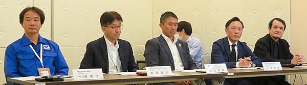 写真左から東光高岳 代表取締役社長 一ノ瀬 貴士 氏、e-Mobility Power 取締役 岩堀 啓治 氏、東光高岳 GXソリューション事業本部EVインフラ推進室長 石村 将章 氏、住友電気工業 電力機器事業部 EVC室 室長 出田 瑞貴 氏、デザインエンジニア・東京大学特別教授 山中 俊治 氏