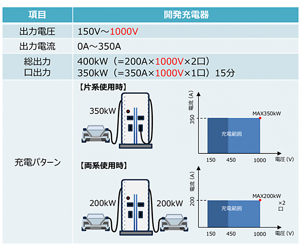 SERA-400は図4に示すように、2口の充電コネクタを備えている。充電器1台の出力電圧1000V、出力電流350Aによって最大出力電力は350kW(=1000V×350A)、ただしこれは1口(EV1台)のみの充電時(片系使用時)で、使用時間は15分に限られる。2口(両系使用時:EV2台を同時充電)では最大出力電流は200Aとなり、総出力が400kWとなる。これを2口で使用すると最大で200kWを2台に充電できる。