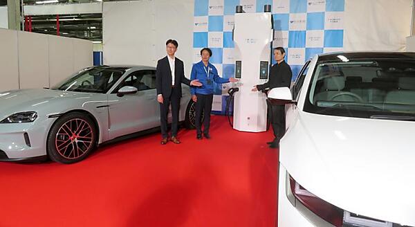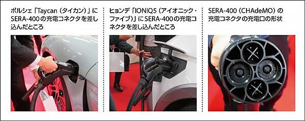 SERA-400の新デザインは初公開された(写真2中央)。併せて高電圧充電対応EVとして独・ポルシェ「Taycan(タイカン)」と韓国・ヒョンデ注9「IONIQ5(アイオニック・ファイブ)」の実車も展示(写真2左右)され、EV充電のデモも行われた(写真3)。SERA-400の発表は、今後のEVの進化や発展を予感させた。