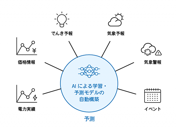 過去データ・気象予測・エリア需給情報をもとに、電力需要に加えて市場価格や計画と実績に差分が生じたときに発生するペナルティ(インバランス料金)を予測する。これにより、市場変動に柔軟に対応できるようにするとともに、電力調達コストの最適化とインバランスリスクの低減を図る。
