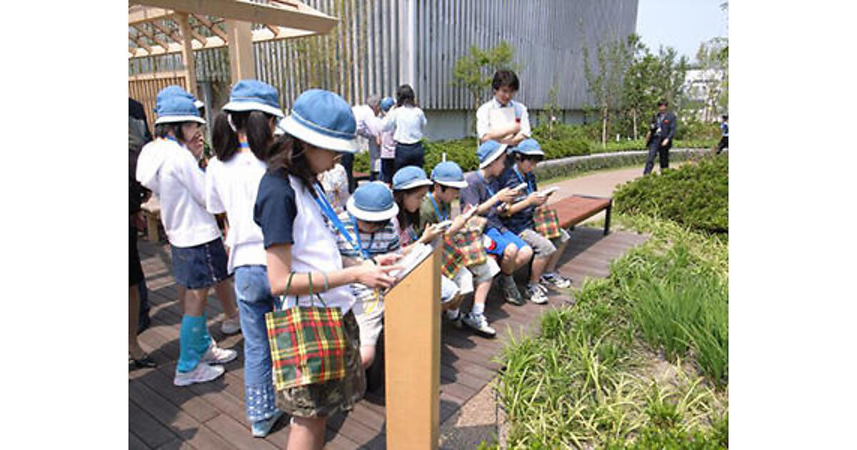 (RFIDタグ(写真中央手前)に携帯端末をかざし、植物についての情報を閲覧する小学生)