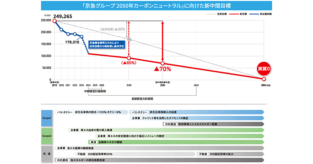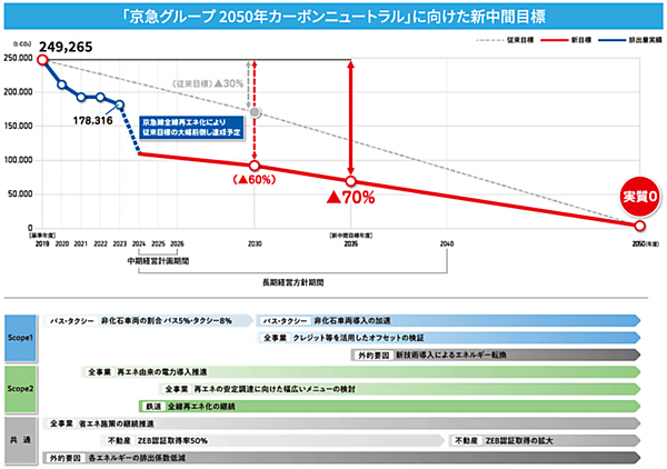 京浜急行電鉄株式会社(以下、京急電鉄)は、グループの温室効果ガス(以下、GHG注1)排出削減が想定を上回るペースで進んでいることを踏まえ、2022年度に策定した長期環境目標「京急グループ 2050年カーボンニュートラル」の中間目標値を改定した。