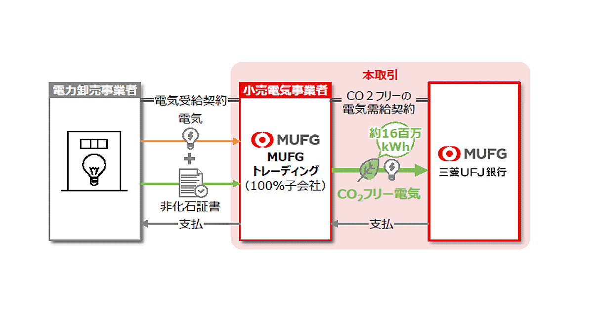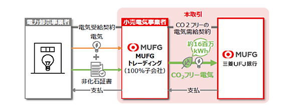 株式会社三菱UFJ銀行(以下、三菱UFJ銀行)は、同社の100%子会社であるMUFGトレーディング株式会社(以下、MUFGトレーディング)から、年間約1,600万kWhの再エネを調達する(2025年7月1日から運用を開始。図1)。