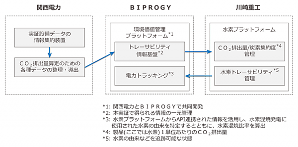関西電力株式会社(以下、関西電力)は、BIPROGY株式会社(以下、BIPROGY)、川崎重工業株式会社(以下、川崎重工)と共同で、水素混焼発電の環境価値を管理する実証を2025年8月22日から開始する。出自の異なる複数の水素を対象にCO2排出量を追跡・記録し、水素混焼発電による電力の由来を識別する技術を確立するのが目的(図1)。同8月19日に発表した。