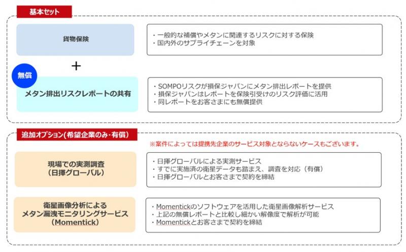 さらに詳細な調査を希望する加入者には、日揮グローバルの地上センサーやドローンを活用したGHG(温室効果ガス)の実測サービスやメタン排出のMRV(Measurement、 Reporting、 Verification:測定、報告、検証)に関するコンサルティング、Momentickの解析ソフトウェアを有償で提供する。これらにより、簡易的なスクリーニングから詳細な実測、排出削減のコンサルティングまでを支援する。