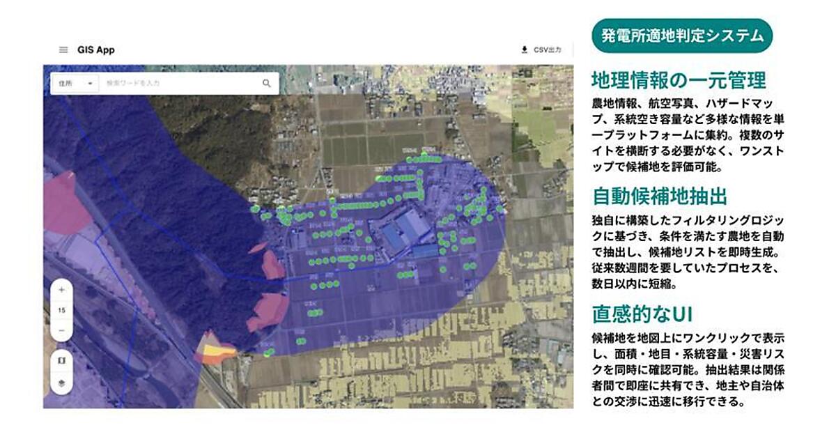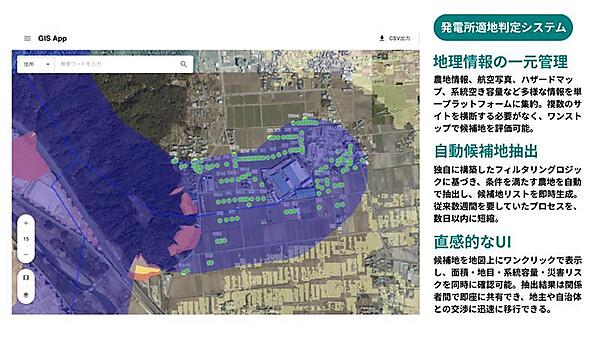 これにより、候補地選定の時間を削減するのに加え、網羅的なスクリーニングによって候補地の絶対数が増加したという。他社に先駆けて優良な農地を確保する体制を構築し、発電所の開発ペースの向上につなげたい考えだ。