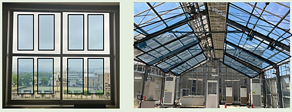 図1 中国電力と麗光が開発する「シースルー型有機薄膜太陽電池」は、従来設置が難しかった建築物の窓(左)や農業用ビニールハウス(右)への設置が可能