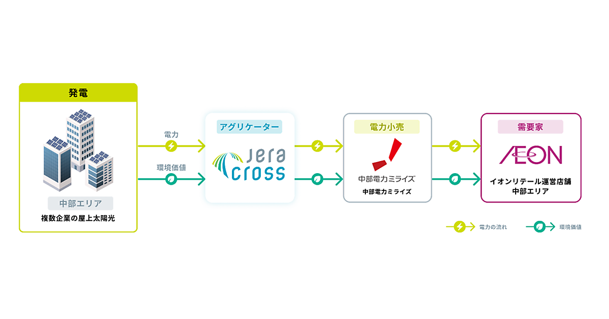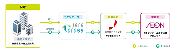 今回の取り組みでは、JERAのグループ会社である株式会社JERA Crossがアグリゲーター注1として、複数の屋根設置型太陽光発電が生み出す余剰電力を束ね、中部電力ミライズ株式会社を通じてイオンリテールの店舗や事務所へと供給する。