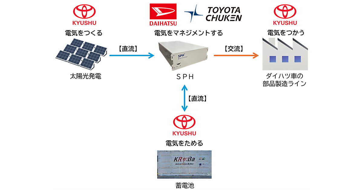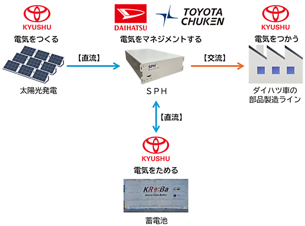 今回の実証実験では、トヨタ九州・小倉工場でSPHを活用し、マイクログリッドシステムを構築する。SPHは、「発電」「蓄電」「使用」の3ポートを持ち、太陽光で発電した電力を直流のまま部品製造ラインに供給し、余剰分を蓄電池に貯めることを可能にする。