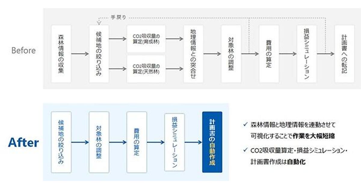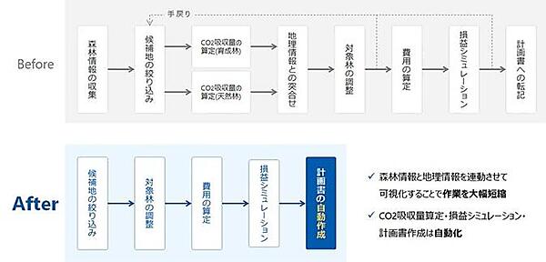 日本は国土の約7割を森林が占める一方、管理の担い手不足や高齢化により森林荒廃が進み、土砂災害や生物多様性の喪失といった課題が顕在化している。森林クレジットは、こうした森林を守り活用する有力な仕組みであるものの、これまでのクレジット創出の過程では、森林簿や森林計画図といった各種データの収集、候補地の選定、吸収量の算定などの作業が必要であり、申請手続きに多大な時間と労力がかかるとともに、専門知識がなければ認証取得が困難であるという。