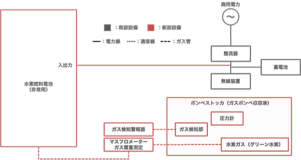 水素燃料電池は、山梨県企業局と連携し、米倉山(山梨県甲府市)における「やまなしモデルP2Gシステム」で生成されたグリーン水素を使用している。水素燃料電池の状態は、EMS(エネルギー・マネジメント・システム)基盤で監視する。