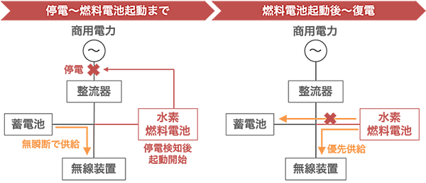 水素燃料電池を蓄電池と並列に接続して使用するには、(1)水素燃料電池の発電電力が蓄電池に充電される、(2)蓄電池の電力使用が優先され、水素燃料電池の発電電力が無線装置に供給されない、という2つの課題があった。
