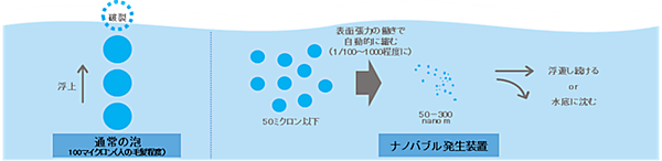 ナノバブルは、特殊な装置で生成された直径50㎛(マイクロメートル)以下の泡が、自己収縮して50~300㎚(ナノメートル)サイズになったもの(図1)。一部の分野で燃焼効率改善や燃料消費量の低減効果が確認されていたが、装置の複雑さやコストが普及の障壁になっていた。