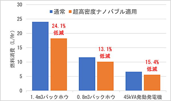 その結果、全ての試験機械で、超高密度ナノバブル発生装置を使用した場合に燃料消費量の低減効果を確認し、最も効果の大きかった1.4m³バックホウで24.1%削減、0.8m³バックホウで13.1%削減、45kVA発動発電機で15.4%削減したという(図2)。