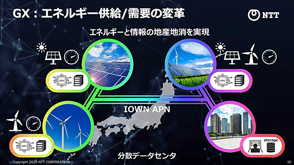 IOWNの特徴である「超低遅延」「超低消費電力」「超広帯域」によって、都市部の電力制約から離れ、発電エリア近傍の地方にデータセンターを展開する構想だ(編注:図2にイメージを示す)。