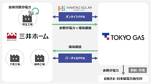余剰電力は市場へ売電するとともに、その追加性注5のある環境価値を環境証書の形で三井ホームに提供する(バーチャルPPA)。三井ホームは、環境証書を千葉や関西の同社工場で活用する。