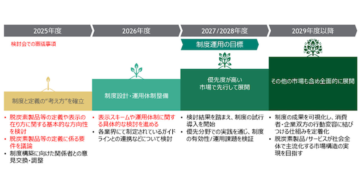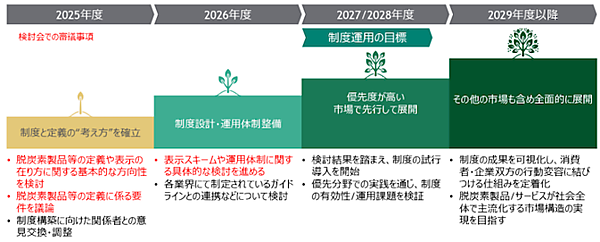 2025年度から2026年度にかけ、同検討会で検討して制度設計・運用体制を整備する。2027年度あるいは2028年度に、優先度が高い市場で先行して制度を開始し、2029年度以降に全面展開する計画だ。