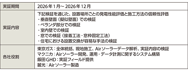 同実証事業は、東京ガス株式会社(以下、東京ガス)、株式会社マクニカ(以下、マクニカ)、飯田グループホールディングス株式会社(以下「飯田GHD」)、株式会社麗光(れいこう。以下、麗光)の4社で行い、実証期間は2026年1月~12月の1年間を予定(表1)。従来のシリコン型太陽電池パネルでは設置が困難だった、住宅の壁面や窓などでの太陽光発電の可能性を探る。