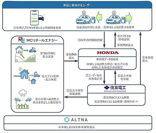 各社の役割は、MCリテールエナジーが、電力小売事業者として実証プランの準備、実証参加者と実証規約などの締結、AC(アグリゲーションコーディネーター)としての電力市場との取引を担当する。住友電工が、AC/RA(リソースアグリゲータ)システムの構築と運用支援を行う。ホンダが、EVの充放電制御の実施といったRAシステムの運用、実証参加者向け専用スマホアプリの開発・提供を担当。ALTNAが、全体の事業性検証、RAとしての経済性検証を担当する。