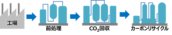 5社が開発するCO₂回収装置は、JCCLが保有するアミン含有ゲル技術注1により、工場の燃焼排ガスなど比較的高濃度の気体からCO₂を回収する。その前処理の工程で、窒素酸化物(NOx)および硫黄酸化物(SOx)を除去する。また、排熱を利用し、省エネルギーで運転する。プラントをコンパクトなサイズにし、他のソリューションと組み合わせ、中小企業にも導入しやすいモデルを構築するという。