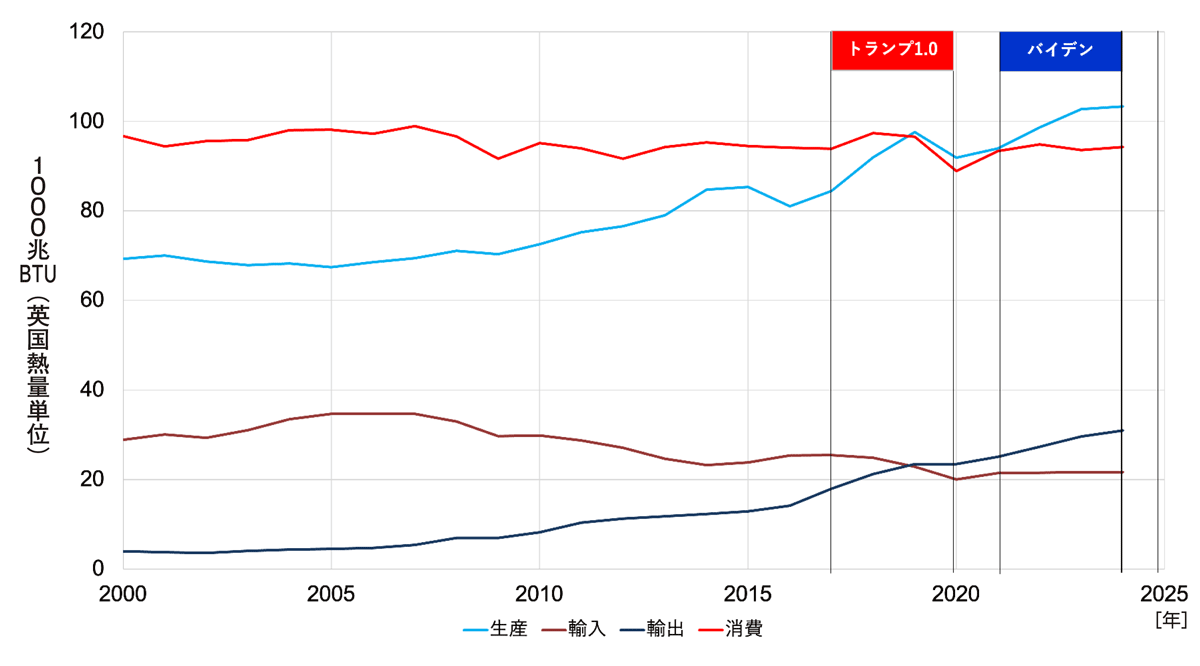図1に示すように、米国のエネルギーの生産量と輸出量は第1次トランプ政権の前政権であるオバマ政権(2009年~2016年)の2010年頃からすでに増加傾向を示し、第1次トランプ政権の後半には生産量が消費量を、輸出量が輸入量を上回った。