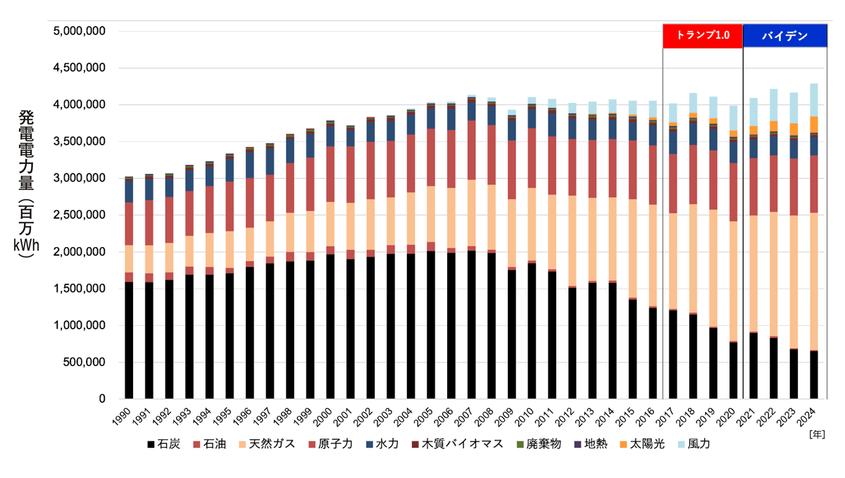 次に、米国の電源構成の推移を見ていく。図3に発電電力量ベースの1990年から2024年までの米国の電源構成を示す。第1次トランプ政権の前のオバマ政権時(2009年~2016年)から、電源構成中の石炭(棒グラフの一番下、黒色)が減り、天然ガス(棒グラフの下から2番目、薄いオレンジ色)が増える傾向が見られたが、第1次トランプ政権、バイデン政権時ともこの傾向は続き、電源としての石炭は減少の一途を辿った。
