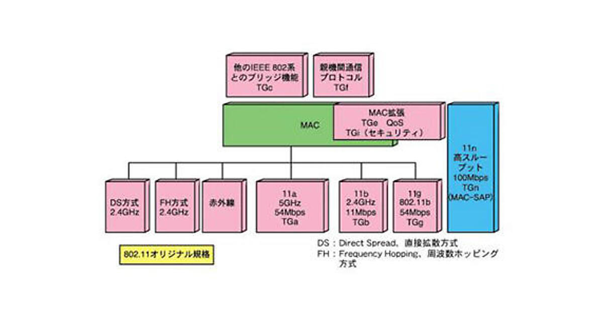 無線LAN(Wireless Local Area Network)に関する標準規格を策定するIEEEの802.11WG は、1990年に設立された。図1に示すように、最初に標準化されたオリジナルの 標準規格は、802.11規格(2.4GHzのISMバンドを使用)として、いずれも100m程度の伝送距離で、伝送速度が1Mbps/2Mbpsの、