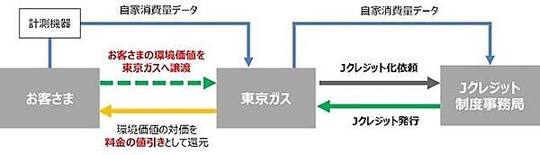 今回、東京ガスが開始したサービスは、東京ガスが顧客に対し、太陽光発電による自家消費量をデータとして計測。それをもとにJ-クレジット制度事務局に申請してJ-クレジットを創出する。発行されたJ-クレジットは東京ガスに譲渡され、その対価としてPPAサービス料金を値引く。顧客に追加の費用負担や手間は発生しない。
