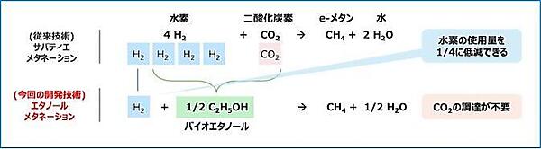 水素製造に要する再生可能エネルギー電力も同様に4分の1で済むため、電力コストの低減が可能だとする。原料となるバイオエタノールは、トウモロコシやサトウキビ由来のカーボンニュートラルな燃料であり、生成されたメタンの燃焼時に発生するCO2も排出量として計上されない。