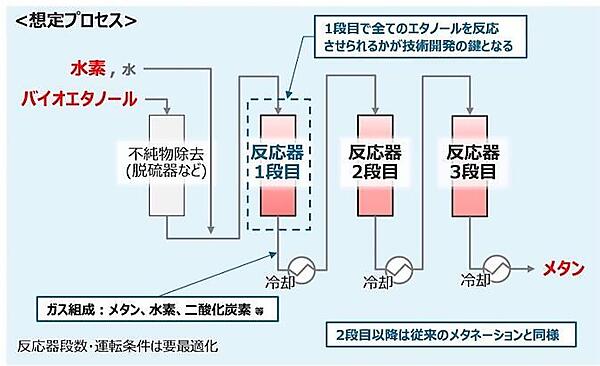 ラボスケールの評価試験では、2000時間にわたる連続運転で反応率100%を維持し、高い耐久性を実証したとする。2段目以降の工程については、既に確立されているサバティエメタネーションの技術を応用し、メタン濃度を高めることが可能であり、技術的課題は概ね解消されたとしている。