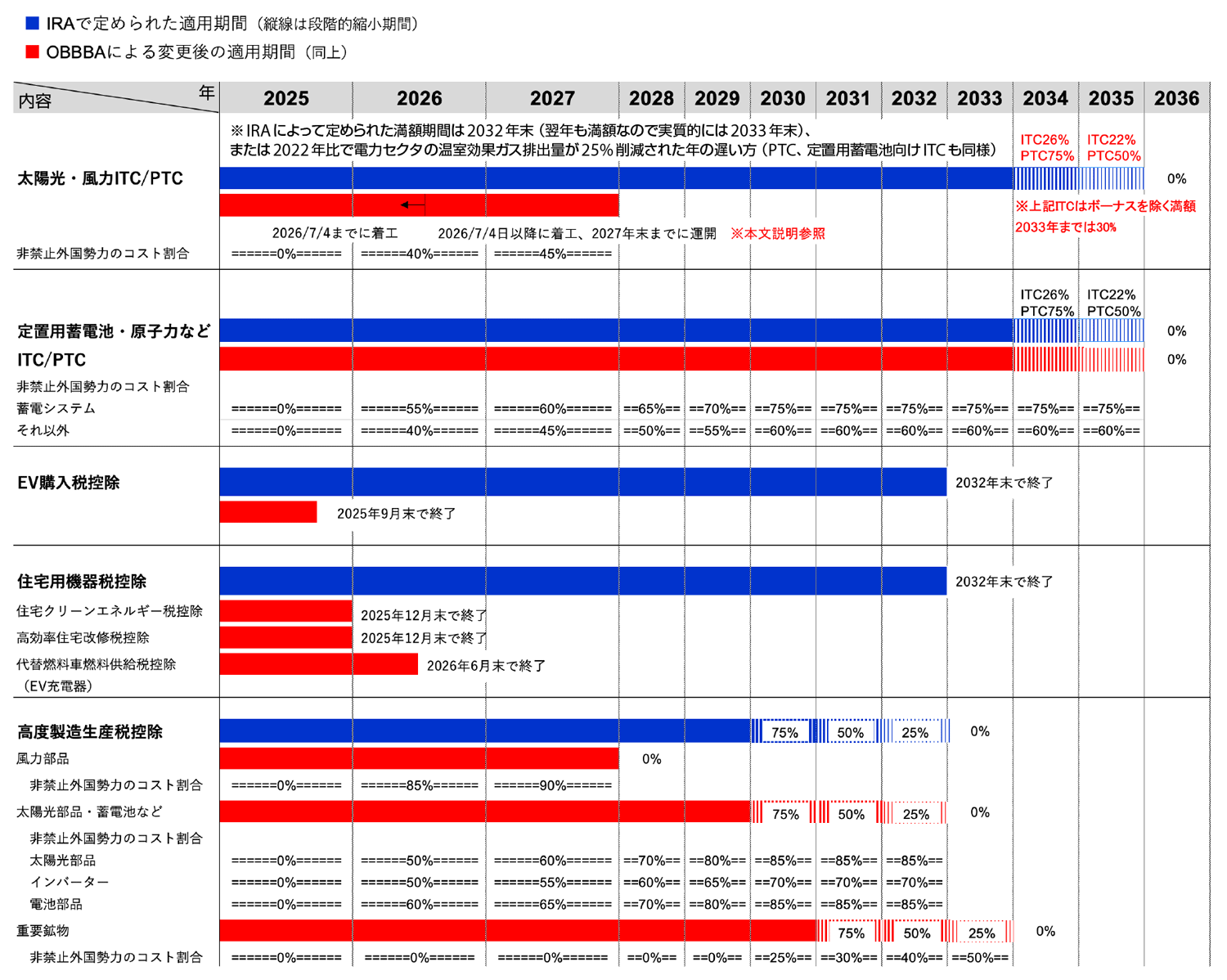 IRAでは、2032年まで延長されていた投資税控除(ITC:Investment Tax Credit、第1回記事参照)と生産税控除(PTC:Production Tax Credit、第1回記事参照)は、OBBBAにより以下の通り縮小された。