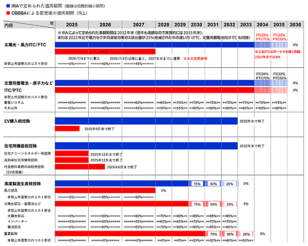 図1に、IRAで定められていたエネルギー関連の税制優遇がOBBBAでどのように変化したかをまとめた。