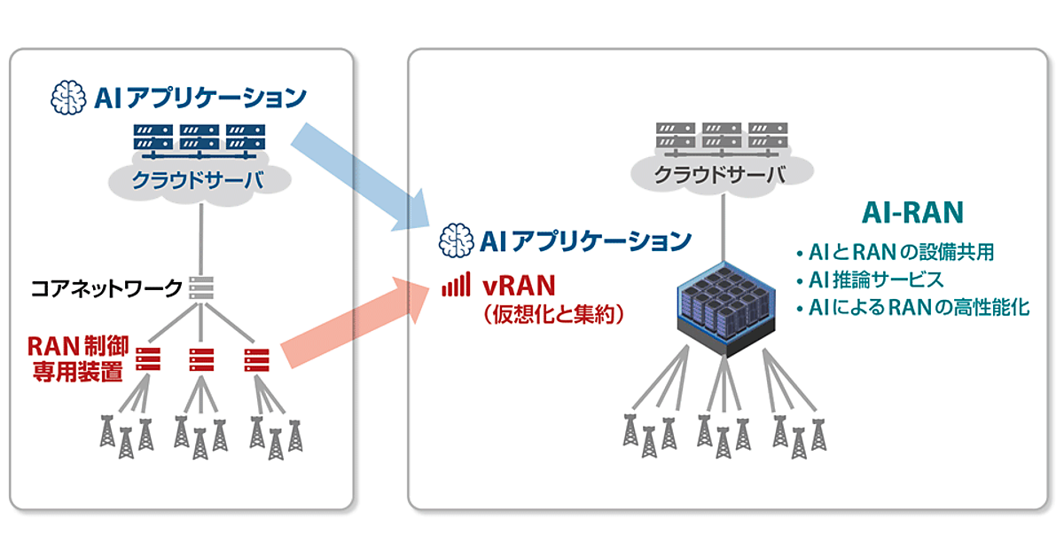 このAI-RANに至るまでのRANの進化を振り返るとvRAN、そしてOpen RANと進化してきている。vRAN(Virtual Radio Access Network、仮想無線アクセスネットワーク)によって汎用的なハードウェア上でRAN機能をソフトウェアとして実行できるようになり、Open RANによってオープン標準インタフェースが採用され、マルチベンダ環境での相互運用性を実現した。AI-RANは、これらの技術進化を踏まえ、AIアプリケーションとRANを同じ基盤上に統合するアーキテクチャである。
