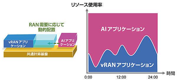 図の左側は共通計算基盤上でvRANアプリケーションとAIアプリケーションが計算リソースを共有し、RANの需要に応じてリソースを動的に再配置する様子を表している。一方、右側のグラフは時間帯によって変動するRANの負荷とAIの負荷の補完関係を表している。グラフの横軸は0時から24時までの時間の推移を、縦軸は計算リソースの使用率を表し、通信需要が少ない時間帯(グラフ中の青い領域が低い部分)には、空いたリソースをAI処理(ピンクの領域)へ自動的に割り当てているイメージを示している(動的な再配置)。