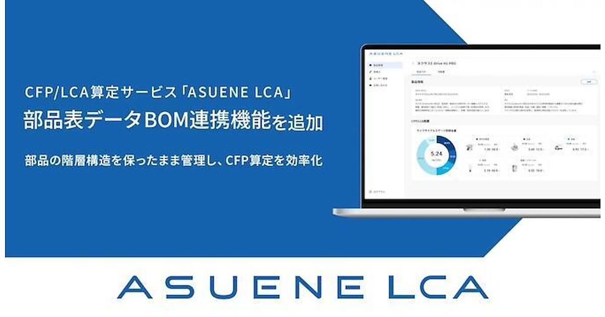 アスエネ株式会社(以下、アスエネ)は、製品の部品構成を示すBOM(Bill of Materials)データと連携し、CFP(カーボンフットプリント)やLCA(ライフサイクルアセスメント)を算定、管理するための機能の提供を開始した。同社のCFP/LCA算定ツール「ASUENE LCA」の1機能として提供する。LCAを製品を構成する部品や原材料の親子関係を保持したまま算定することで、製造業を中心にCFP算定、環境情報開示の業務効率を高めるとする。2026年1月20日に発表した。