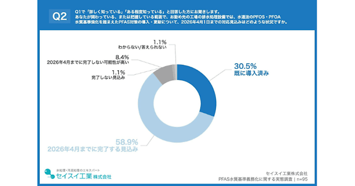 2026年4月1日に施行される改正水道法注1による水質基準強化を前に、製造業で約9割が期限内の対応を見込んでいる。こうした調査結果を水処理・汚泥処理を手掛けるセイスイ工業株式会社(以下、セイスイ工業)が2026年1月22日に発表した。その一方で、PFAS(有機フッ素化合物)注2除去後に発生する、汚泥や濃縮水の処理などの二次処理が課題になっているという。