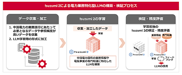 こうした課題を解決するため、今回、日本語処理に強みを持つLLM「tsuzumi 2注3」(NTT株式会社製)に、電気事業や中国電力の独自データを学習させることで、実務に即した高度な判断を支援するLLMの構築を決定した。